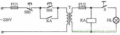 工作原理:閉合S後,按下按鈕SB1,變壓器得電輸出36V低電壓,使得繼電器或交流接觸器KA吸合。放鬆按鈕SB1後,KA自鎖觸點使KA保持吸合,繼續給變壓器接通電源。如果變壓器次級發生短路故障,繼電器線圈電壓為零,此時KA便失電釋放,將變壓器電源斷開,保護變壓器不被破壞。