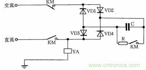 直流電磁鐵停電後,因有剩磁存在,有時會造成不良後果。因此,必須設法消除剩磁。圖9中,YA是直流電磁鐵線圈,KM是控製YA啟停的接觸器。KM吸合時,YA通電勵磁;KM複位時,YA斷直流電,並進行快速退磁。