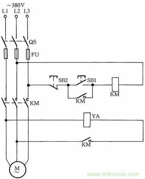 線路中YA為製動電磁鐵,在通電後,製動解除;在斷電後,YA立即製動。