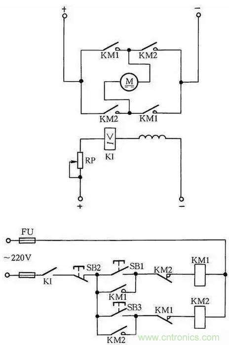 在勵磁電路內,串聯一個欠電流繼電器KI,其常開觸點接在控製電路中。當勵磁電流消失或減小到設定值時,KI釋放,KI常開觸點斷開,切斷電動機電樞電源,使電動機停轉,從而避免超速現象發生,見圖11。