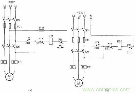 接觸器線圈電壓為380V時,可按圖12(a)所示接線;接觸器線圈電壓為220V時,可按圖12(b)接線。圖12(a)的(de)接(jie)線(xian)還(hai)有(you)缺(que)陷(xian),即(ji)在(zai)電(dian)動(dong)機(ji)停(ting)轉(zhuan)時(shi),其(qi)引(yin)出(chu)線(xian)及(ji)電(dian)動(dong)機(ji)帶(dai)電(dian),使(shi)維(wei)修(xiu)不(bu)大(da)安(an)全(quan)。因(yin)此(ci),這(zhe)種(zhong)線(xian)路(lu)隻(zhi)能(neng)在(zai)應(ying)急(ji)時(shi)采(cai)用(yong),並(bing)在(zai)維(wei)修(xiu)電(dian)動(dong)機(ji)時(shi),應(ying)斷(duan)開(kai)控(kong)製(zhi)電(dian)動(dong)機(ji)的(de)總(zong)電(dian)源(yuan)開(kai)關(guan)QS,這一點應特別注意。