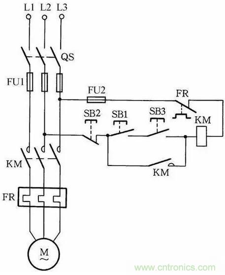 當交流接觸器的輔助觸點損壞無法修複而又急需使用時,采用圖12中所示的接線方法,可滿足應急使用要求。按下SB1,交流接觸器KM吸合。放鬆按鈕SB1後,KM的觸點兼作自鎖觸點,使接觸器自鎖,因此KM仍保持吸合。