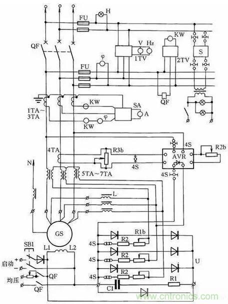 HF-4-81係列發電機控製線路如圖15所示,它與T2XV係列小型三相同步發電機配套。同步發電機的勵磁係統采用電複合相複勵調壓。發電機端電壓經線性電抗器L移相,然後與發電機負荷電路中的電流互感器5TA~7TA二次電壓合成,經三相橋式整流器整流後,供發電機GS勵磁自動調壓。