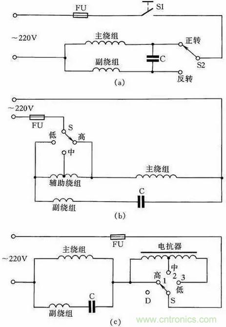 圖16(c)為帶電抗器調速的電容電動機接線線路。由於電抗器繞組(其在線路中起到降壓作用)的串入,調節電抗器繞組的串入量,即可改變轉速。這種方法目前廣泛應用在家用電風扇線路中。在啟動電動機時一般先撥到“1”擋上,即為高擋,這時電抗器不接入線路,使電動機在全壓下啟動,然後再撥“2”擋或任何擋來調節電動機轉速。