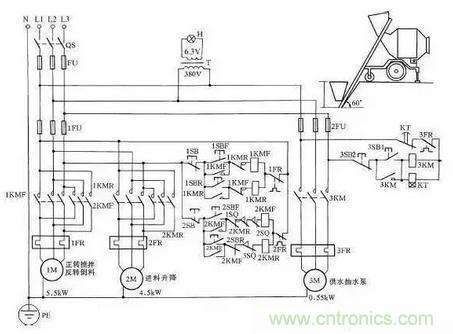 加水完畢即可實施攪拌。按下1SBF正轉按鈕,1KMF得電吸合,1M正轉攪拌,攪拌完畢後按下1SB停止按鈕即可停止。出料時,按下1SBR按鈕,1M反轉即可把混凝土泥漿自動攪拌出來。然後按下1SB,接觸器1KMR斷電釋放,1M停轉,出料停止。