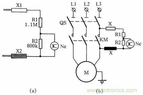 如果絕緣電阻合乎標準(即絕緣電阻值大於0.5MΩ),則泄漏電流很小時,在R2上的電壓降小於氖泡的點燃電壓,Ne不亮;當任意兩相或三相同時對機殼的絕緣電阻降低時,泄漏電流大增,使氖泡Ne點燃,從而可判定絕緣不合格。