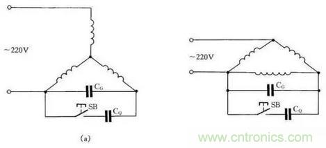 如圖19所示:圖(a)為Y形接法電動機連接方法,圖(b)為△形接法電動機連接方法。為了提高啟動轉矩,將啟動電容CQ在啟動時接入線路中,在啟動完畢後退出。