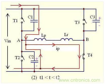 如上圖,此時T1與T4同時導通,T2與T3同時關斷,原邊電流的流向是T1—Lp—Lk—T4,如圖所示。