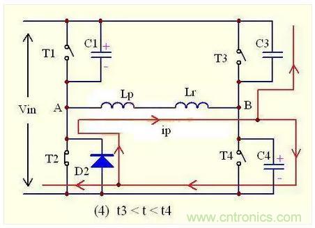 由於T4的關斷,原邊電流ip突然失去通路,但由電感的原理我們知道,原邊電流不允許突變,需要維持原來的方向,以一定的速率減少。所以,原邊電流ip會對C4充電,使C4兩端的電壓慢慢往上升,同時抽走C3兩端的電荷。