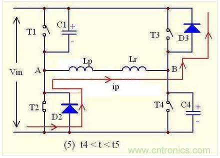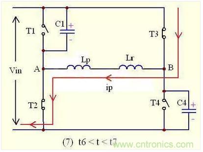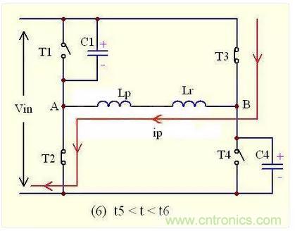 在t5-t6的時間內,副邊的二極管D1,D2還是同時導通流過電流,將副邊繞組短路,阻斷輸出電感反射到初級的途徑,此時的負載電流還是由次級電感與輸出電容提供;同時,由於原邊的T2,T3已經導通,原邊電流ip流過T3--Lr--T2,又因為Lr很小,所以原邊電流ip就會反向急劇增大。