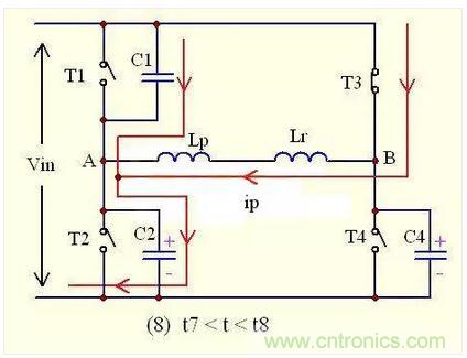 如上圖,此時超前橋臂下管T2在t7時刻關斷,但由於電感兩端電流不能突變的特性,變壓器原邊的電流仍然需要維持原來的方向,故電流被轉移到C1與C2中,C2被充電,電壓很快會上升到輸入電壓Vin,而C1的電荷很快就被抽走,C1兩端電壓很快就下降到0V,即將A點的電位鉗位到Vin。