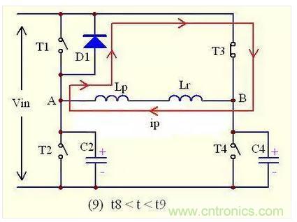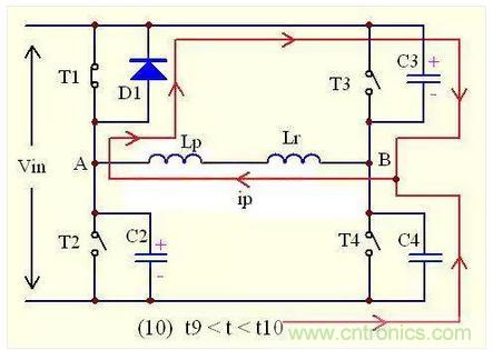 由於T3的關斷,原邊電流ip突然失去通路,但由電感的原理我們知道,原邊電流不允許突變,需要維持原來的方向,以一定的速率減少。所以,原邊電流ip會對C3充電,使C3兩端的電壓慢慢往上升,同時C4開始放電。即 ip(t)=-I2sinω(t-t9)
