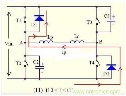 如圖所示,在t11時刻之前,T4已經導通,在t11時刻原邊電流ip已經上升到0,由於沒有了電流,所以D1,D4自然關斷。