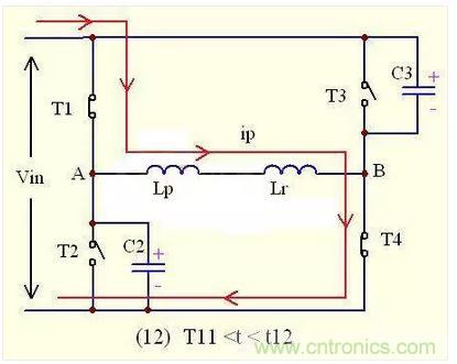 在t11-t12的時間內,副邊的二極管D1,D2還是同時導通流過電流,將副邊繞組短路,阻斷輸出電感反射到初級的途徑,此時的負載電流還是由次級電感與輸出電容提供;同時,由於原邊的T1,T4已經導通,原邊電流ip流過T1--Lr—T4,又因為Lr很小,所以原邊電流ip就會正向急劇增大。