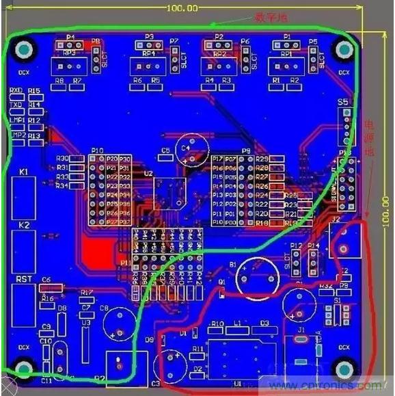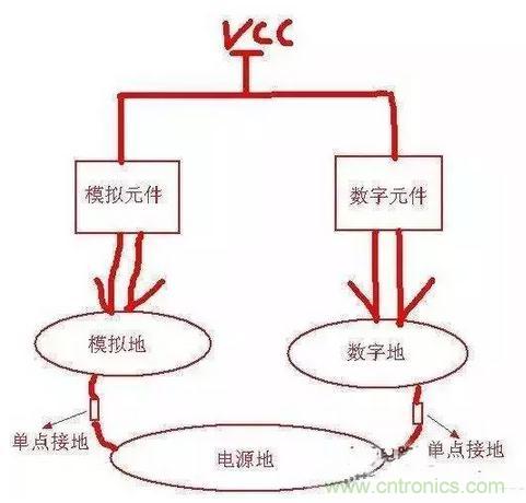 從這個圖可以看出:模mo擬ni地di和he數shu字zi地di是shi完wan全quan分fen開kai的de,最zui後hou都dou單dan點dian接jie到dao了le電dian源yuan地di,這zhe樣yang可ke以yi防fang止zhi地di信xin號hao的de相xiang互hu串chuan擾rao而er影ying響xiang某mou些xie敏min感gan元yuan件jian,眾zhong所suo周zhou知zhi數shu字zi元yuan件jian對dui幹gan擾rao的de容rong忍ren度du要yao強qiang於yu模mo擬ni元yuan件jian,而er數shu字zi地di上shang的de噪zao聲sheng一yi般ban比bi較jiao大da所suo以yi將jiang它ta們men的de地di分fen開kai就jiu可ke以yi降jiang低di這zhe種zhong影ying響xiang了le。還hai有you單dan點dian接jie地di的de位wei置zhi應ying該gai盡jin量liang靠kao近jin板ban子zi電dian源yuan地di的de入ru口kou(起始位置),這樣利用電流總是按最短路徑流回的原理可將幹擾降到最小。
