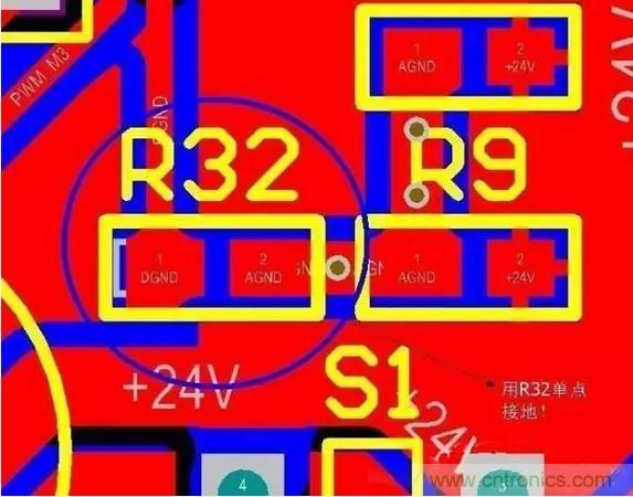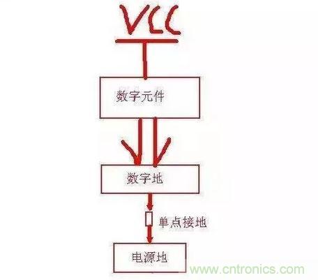 從此圖可以看出:隻在電源地和數字地之間用一個0歐電阻或磁珠之類的單點接地就行了,同樣單點接地的位置應該盡量靠近板子電源地的入口(起始位置)。