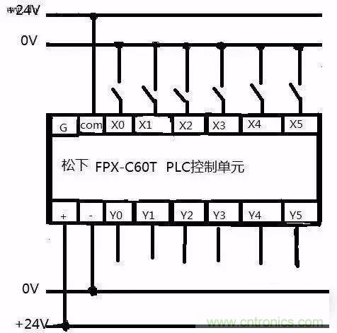 圖中鬆下PLC為直流彙點式輸入,即所以輸入點共用一個公共端COM,同時COM端內帶有DC24V電源,在編寫程序時注意外部設備使用的是常閉還是常開觸點
