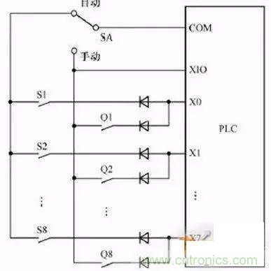 如圖上係統分自動和手動兩種工作方式,Q1-Q8為手動方式用到的 輸入信號,S1-S8為自動方式用到的輸入信號。S1和Q1共用輸入點X0,PLC運行時隻會用到其中一組信號,所以可以共用PLC的輸入點。(圖中二極管是用來防止寄生回路,避免錯誤輸入信號的產生。