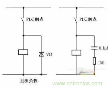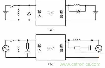 當PLC輸入輸出端接有感性負載元件時,直流輸出的續流管保護(直流電路兩端並聯續流二極管),交流輸出阻容吸收電路。