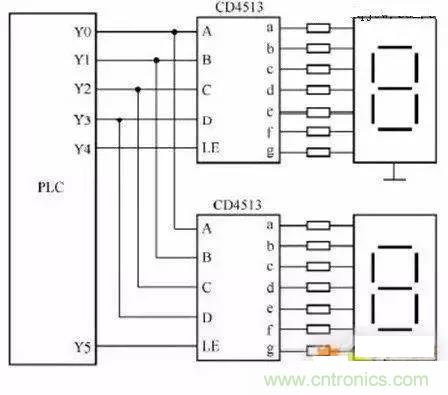 上圖兩隻CD4513的數據輸入端A-D共用PLC四個輸出端Y0-Y3,A為最底D為最高,LE 為寄存輸入端,當LE 為高電平時,輸入數據將存在芯片內的寄存器中,並將其譯碼後顯示出來。如PLC使用繼電器輸出模塊時,與CD4513相連的輸出各端在接一個下拉電阻,避免輸出繼電器斷開的時候CD4513輸入端懸空。