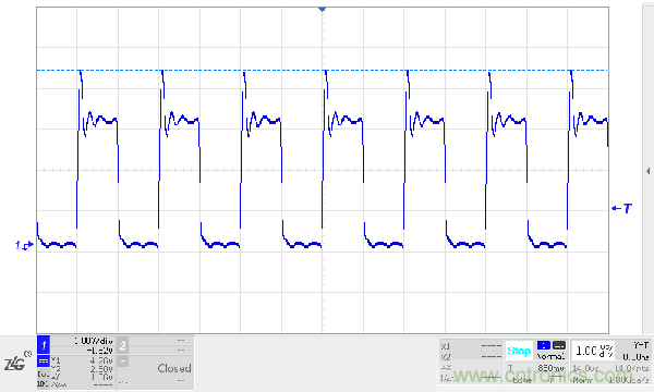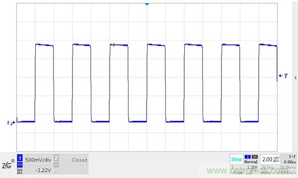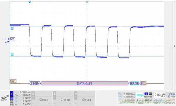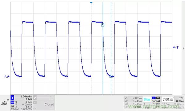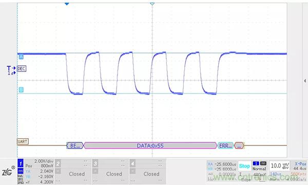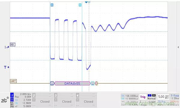 在顯性狀態期間,總線的寄生電容會被充電,而在恢複到隱性狀態時,這些電容需要放電。如果CANH、CANL之間沒有放置任何阻性負載,電容隻能通過收發器內部的差分電阻放電。我們在收發器的CANH、CANL之間加入一個220PF的電容進行模擬試驗,位速率為500kbit/s,波形如下圖所示。
