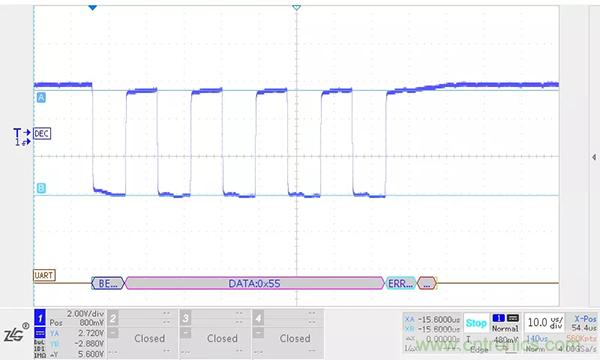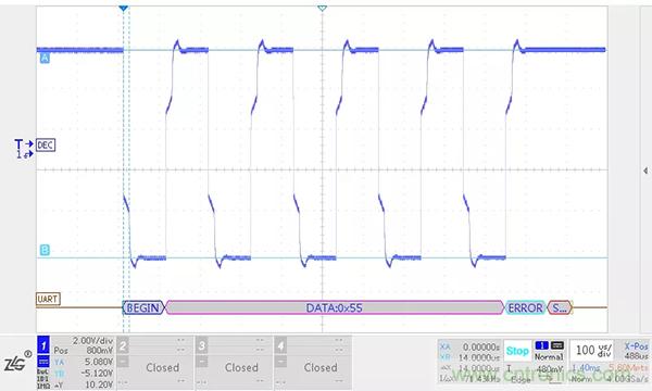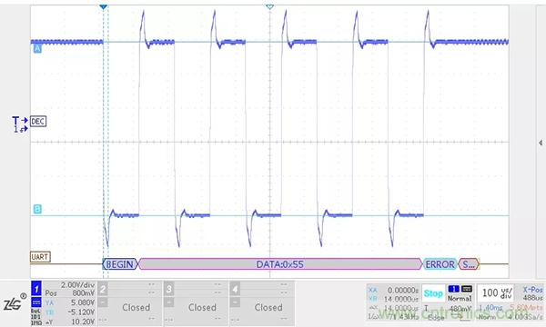 RS-485總線上的負載越大,RS-485收發器輸出差分電壓幅值越低,RSM485ECHT在5m,500kbps的情況下不加終端電阻和加終端電阻的波形如下圖所示。