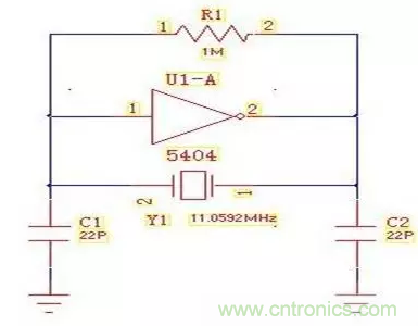 Y1是晶體,相當於三點式裏麵的電感,C1和C2就是電容,5404非門和R1實現一個NPN的三極管,接下來分析一下這個電路。