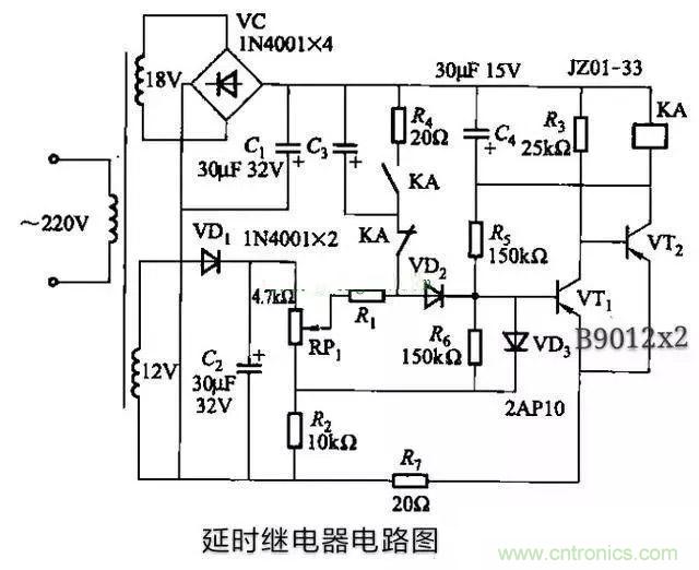 它工作使用一微型變壓器降壓,初級輸入電源為AC交流220Ⅴ,次級有二組電源AC18Ⅴ AC12Ⅴ,AC18V經橋式整流二極管(1N4001×4),C1(30uf/32V)濾波後,為kA微型繼電器、複合三極管ⅤT1 ⅤT2(9012)提供直流DC工作電源。另一組AC交流12Ⅴ電經vD1半波整流,C2電解電容濾波,供給調整充電時間專用可變電位器RP1,C3為一獨石電容,其工作特性較好而用於延時充放電電路中。圖中有JZ01一33繼電器的kA常開和一組kA常閉觸頭,它們在電路中主要作用就是上麵給大家說的,通電、斷電延時繼電器在完成預置時間後恢複原始狀態,進行下一步工作做好準備。