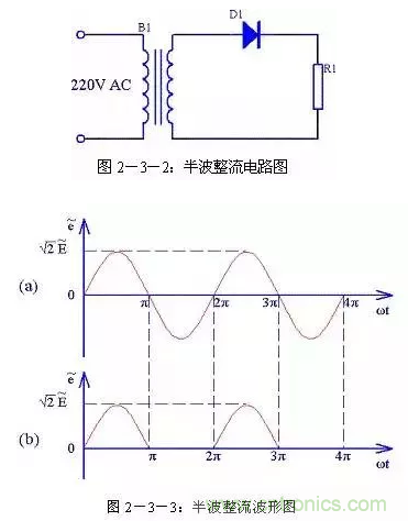半波整流電路見圖2-3-2。其中B1是電源變壓器,D1是整流二極管,R1是負載。B1次級是一個方向和大小隨時間變化的正弦波電壓,波形如圖 2-3-3(a)所示。0~π期間是這個電壓的正半周,這時B1次級上端為正下端為負,二極管D1正向導通,電源電壓加到負載R1上,負載R1中有電流通過;π~2π期間是這個電壓的負半周,這時B1次級上端為負下端為正,二極管D1反向截止,沒有電壓加到負載R1上,負載R1中沒有電流通過。在 2π~3π、3π~4π等後續周期中重複上述過程,這樣電源負半周的波形被“削”掉,得到一個單一方向的電壓,波形如圖2-3-3(b)所示。由於這樣得到的電壓波形大小還是隨時間變化,我們稱其為脈動直流。
