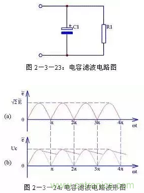 電容濾波電路圖見圖2-3-23,電容濾波電路是利用電容的充放電原理達到濾波的作用。在脈動直流波形的上升段,電容C1充電,由於充電時間常數很小,所以充電速度很快;在脈動直流波形的下降段,電容C1放電,由於放電時間常數很大,所以放電速度很慢。在C1還沒有完全放電時再次開始進行充電。這樣通過電容C1的反複充放電實現了濾波作用。濾波電容C1兩端的電壓波形見圖2-3-24(b)。