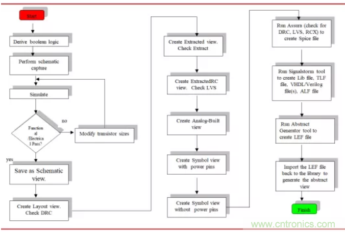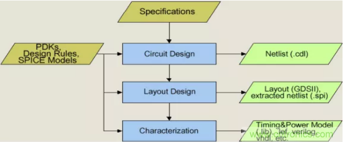 對於數字電路中的標準單元設計,是從布爾邏輯(Boolean logic)描述並定義單元的邏輯關係開始,接著是電路設計(schematic capture或circuit design)與電路仿真(circuit simulation),而後開始版圖設計。版圖設計需要符合製造工藝規則檢查(design rule check,DRC)和版圖電路一致性檢查(layout versus schematic,LVS)通過才算完成,這時,版圖設計的結果用“圖形顯示係統第二版”(graphic display system II,GDSII)文件記載,並作為芯片製造中製作掩模板(mask)的依據。數字電路的標準單元和I/O單元完成版圖設計後,還要做寄生參數(電阻R電容C)提取(parasitic extraction,RCX),供電路設計者作進一步擬合優化處理,這種反標方法(back-annotation)也是芯片級設計的重要步驟之一。圖2給出了比較完整的版圖設計全流程圖。