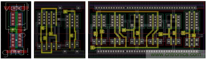 對於標準單元的版圖,根據工藝要求,標準邏輯單元的高度是固定的,寬度為最小單元寬度的公約數倍數,例如在圖3中,左圖為反向器(inverter,INV)的版圖,中圖為選擇器(multiplexer,MUX)的版圖,右圖為D型寄存器的(D-Flip Flop, DFF)的版圖。如上所述,從版圖設計中,可以導出並建立GDSII和LEF文件。GDSII文件經過設計簽核(design sign-off)過程由代工廠使用於芯片製造,LEF文件用於全芯片的P&R物理設計。