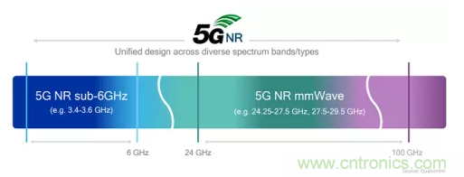 5G通信采用的頻段規範稱作“5G新空口”(5G New Radio,5G NR),使用6 GHz以下頻率以及毫米波波段,見圖5。數據率為10~20Gbps