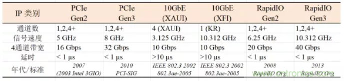 物聯網和5G聯網通信中除了信號收發單元(transceiver, TRX 以及TX/RX)設計芯片之外,離不開專用的係統芯片SoC,其中高性能與高速核心IP往往決定了SoC的性能和速度。常見的高性能與高速核心IP有: PCIe, 10 Gigabit Ethernet (10 GbE), RapidIO, SerDes, USB等。表1列出了幾種物聯網和5G時代常用的高性能與高速IP的信號速度和數據率。