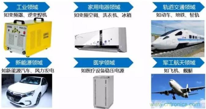 作為新型功率半導體器件的主流器件,IGBT已廣泛應用於工業、 4C(通信、計算機、消費電子、汽車電子)、航空航天、國防軍工等傳統產業領域,以及軌道交通、新能源、智能電網、新能源汽車等戰略性新興產業領域。