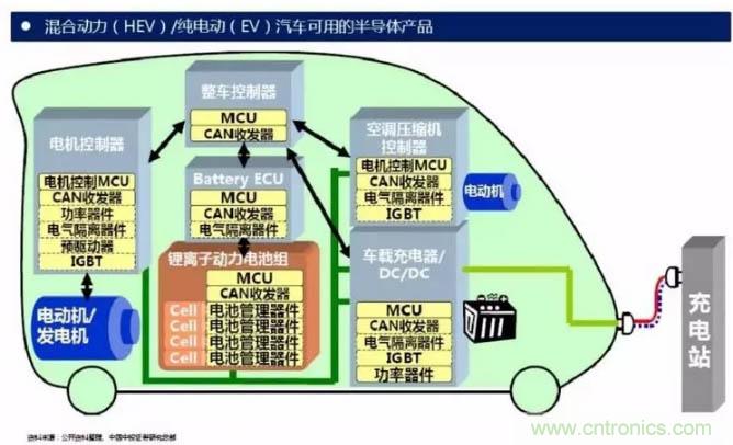 IGBT模塊在電動汽車中發揮著至關重要的作用,是電動汽車及充電樁等設備的核心技術部件。IGBT模塊占電動汽車成本將近10%,占充電樁成本約20%。IGBT主要應用於電動汽車領域中以下幾個方麵: