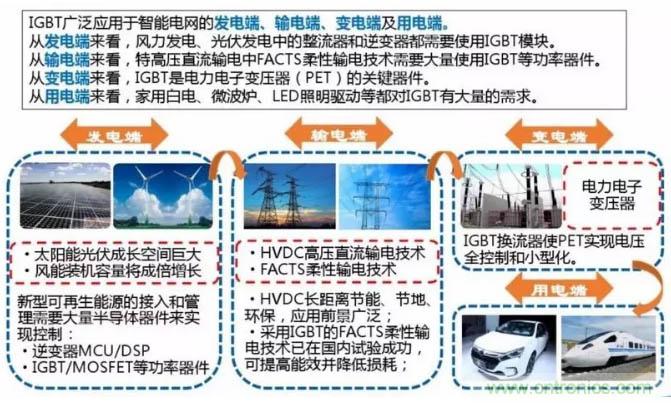 IGBT廣泛應用於智能電網的發電端、輸電端、變電端及用電端: