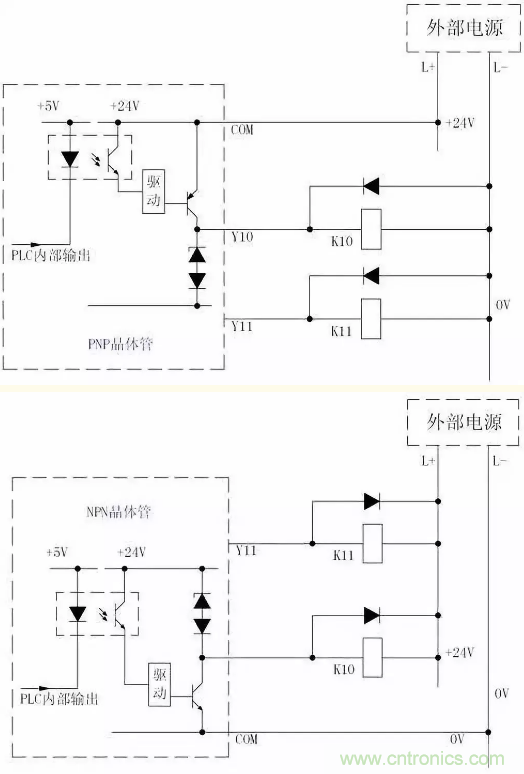 由以上兩圖可看出這兩種晶體管輸出電路形式的區別:NPN型集電極開路輸出形式的公共端COM隻能接外接電源的負極,而PNP型的COM端隻能接外接電源的正極。