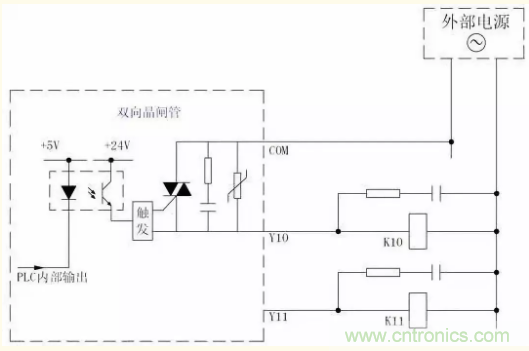 為了保護晶閘管,通常在PLC內部電路晶閘管的兩端並接RC阻容吸收元件(一般為0.015uF/22Ω左右)和壓敏電阻,因此在晶閘管關斷時,PLC的輸出仍然有1~2mA的開路漏電流,這就可能導致一些小型繼電器在PLC輸出OFF時無法關斷的情況。