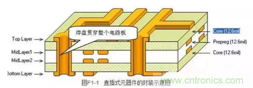 直插式元器件封裝的焊盤一般貫穿整個電路板,從頂層穿下,在底層進行元器件的引腳焊接,如圖所示。