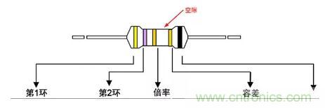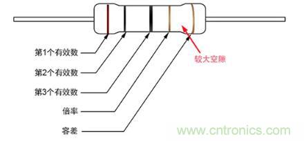 確que定ding電dian阻zu環huan數shu的de一yi個ge關guan鍵jian指zhi標biao是shi觀guan察cha各ge環huan之zhi間jian的de空kong隙xi。大da多duo數shu電dian阻zu公gong司si會hui先xian在zai倍bei率lv和he容rong差cha環huan之zhi間jian設she置zhi較jiao大da的de空kong隙xi,然ran後hou在zai其qi他ta環huan之zhi間jian設she置zhi空kong隙xi。下xia麵mian以yiYageo供應的電阻為例,這是一個帶有特殊環的4環電阻。