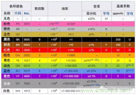 根據IEC 60062:2016的規定,標準顏色代碼可能表示溫度係數。