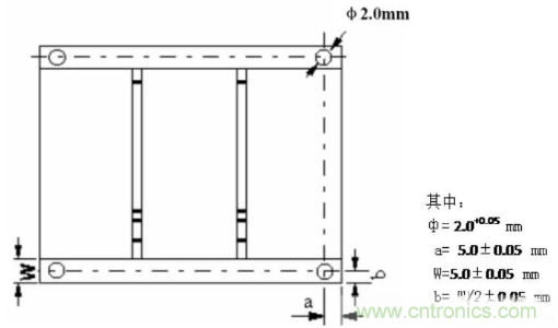 在拚板外框的四角開出四個定位孔,孔徑4mm±0.01mm;孔的強度要適中,保證在上下板過程中不會斷裂;孔徑及位置精度要高,孔壁光滑無毛刺。