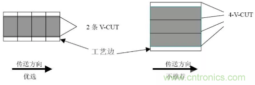 拚板方向應平行傳送邊方向設計, 當尺寸不能滿足上述拚版尺寸要求的例外。一般要求“V-CUT”或郵票孔線數量≤3(對於細長的單板可以例外),見圖3.4。