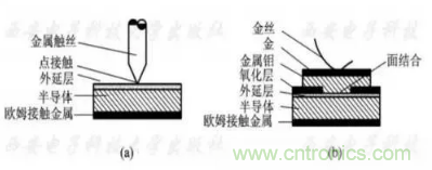 點接觸型管芯用一根金屬絲壓接在N型半導體外延層表麵上形成金半接觸。麵結合型管芯先要在N型半導體外延層表麵上生成二氧化矽(SiO2)保護層,再用光刻的辦法腐蝕出一個小孔,暴露出N型半導體外延層表麵,澱積一層金屬膜(一般采用金屬鉬或鈦,稱為勢壘金屬)形成金半接觸,再蒸鍍或電鍍一層金屬(金、銀等)構成電極。