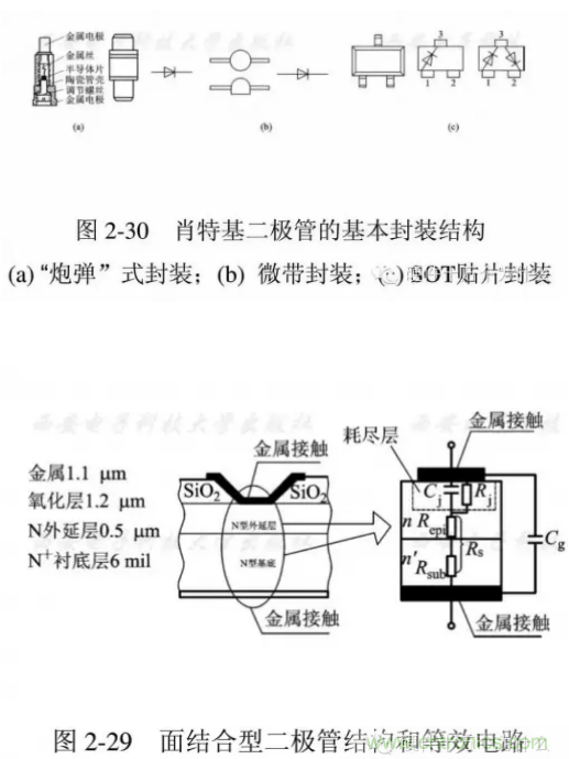 因此性能穩定,一致性好,不bu易yi損sun壞huai。圖tu中zhong給gei出chu一yi種zhong麵mian結jie合he型xing二er極ji管guan的de結jie構gou圖tu和he等deng效xiao電dian路lu。從cong中zhong可ke以yi看kan出chu各ge部bu分fen的de結jie構gou尺chi寸cun量liang級ji。通tong常chang這zhe種zhong管guan芯xin要yao進jin行xing封feng裝zhuang才cai能neng方fang便bian地di使shi用yong。肖xiao特te基ji勢shi壘lei二er極ji管guan的de典dian型xing封feng裝zhuang結jie構gou可ke采cai用yong“炮彈”式、微帶式、SOT貼片式等如圖2-30所示。