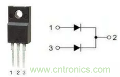 采用TO–220或TO–3P封裝的大功率快恢複二極管,有單管和雙管之分。雙管的管腳引出方式又分為共陽和共陰。
