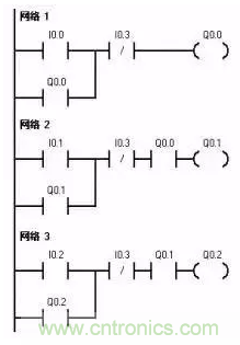 2. 單向順序停止控製電路就是要求按一定順序停止已經執行的各機構。隻有Q0.2被停止後才可以停止Q0.1,若想停止Q0.0,則必須先停止Q0.1。I0.4為急停按鈕。