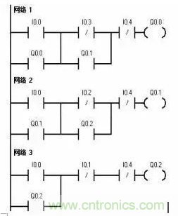 1. 單向順序啟動控製電路是按照生產工藝預先規定的順序,在各個輸入信號的作用下,生產過程中的各個執行機構自動有序動作。隻有Q0.0啟動後,Q0.1方可啟動,Q0.2必須在Q0.1啟動完成後才可以啟動。