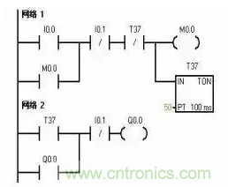 1.延時啟動控製 設計延時啟動程序,要利用中間繼電器(內部存儲器M)的自鎖狀態使定時器能連續計時。定時時間到,其常開觸點動作,使Q0.0動作。